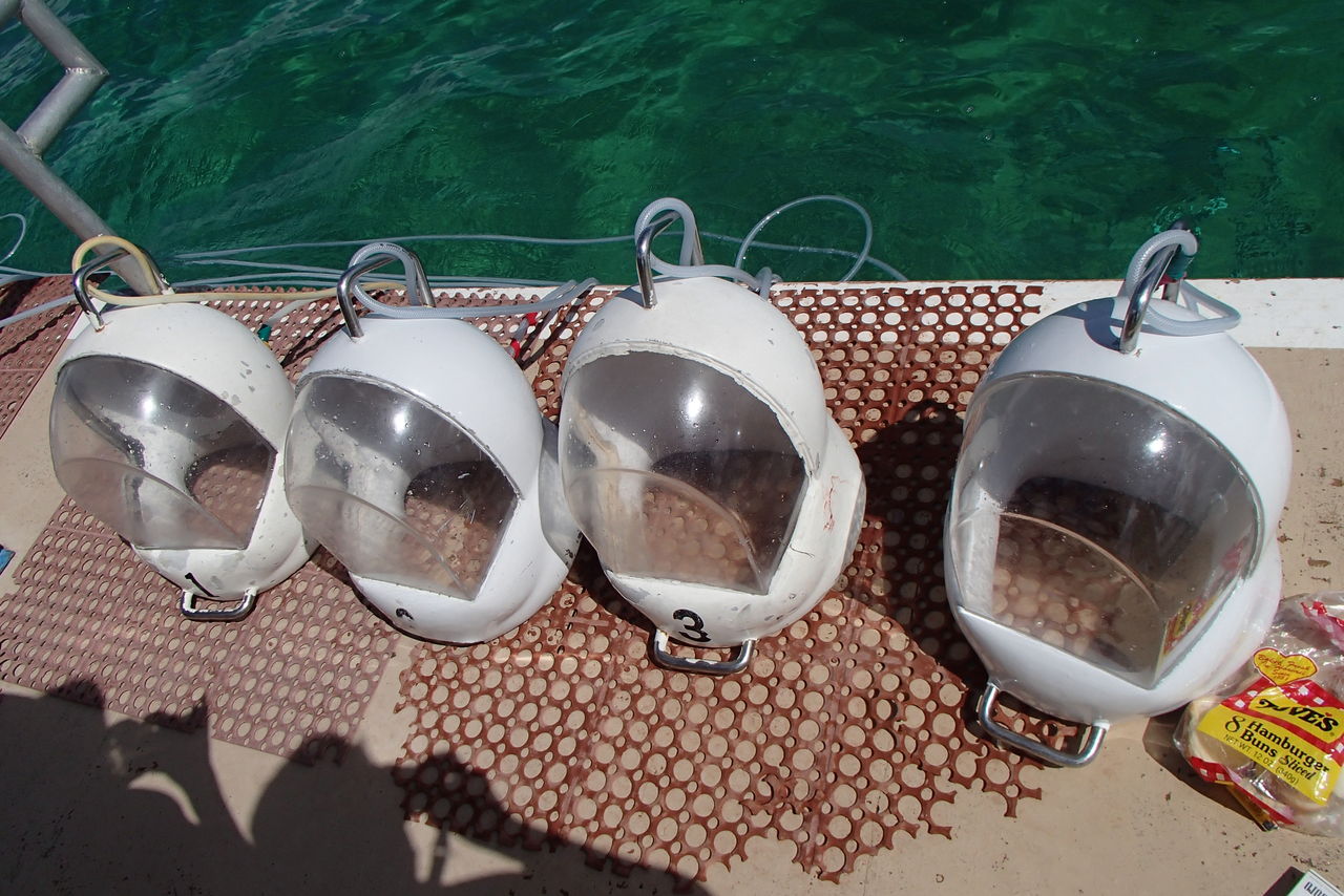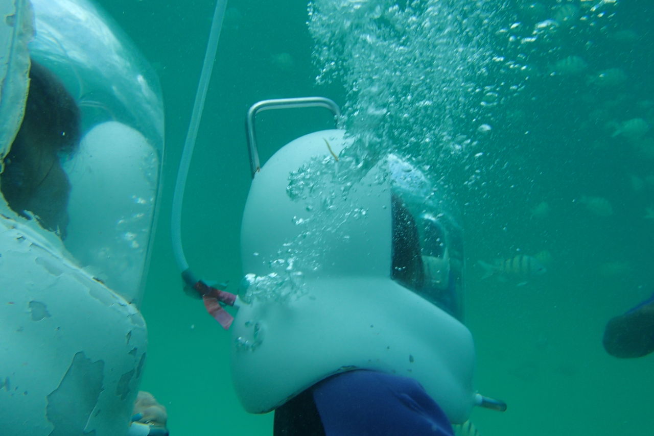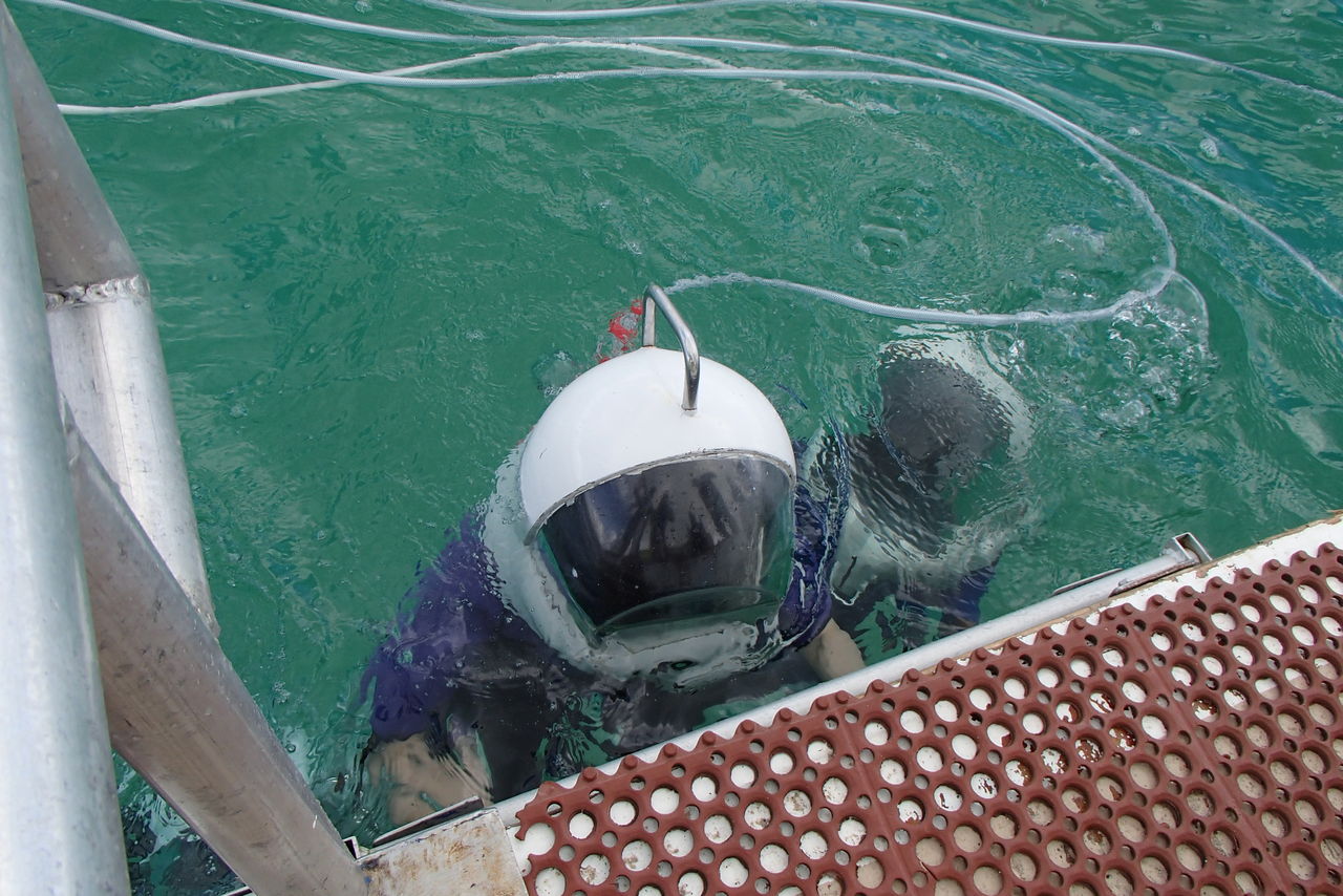 このヘルメットをかぶります。すごく重たくて地上で持ち上げようとしてもビクともしなかった。 ハシゴで降りて水中から頭だけ出した状態でかぶせてもらいます。 水に入ると、ハシゴを一段降りただけで耳が聞こえなくなりました。